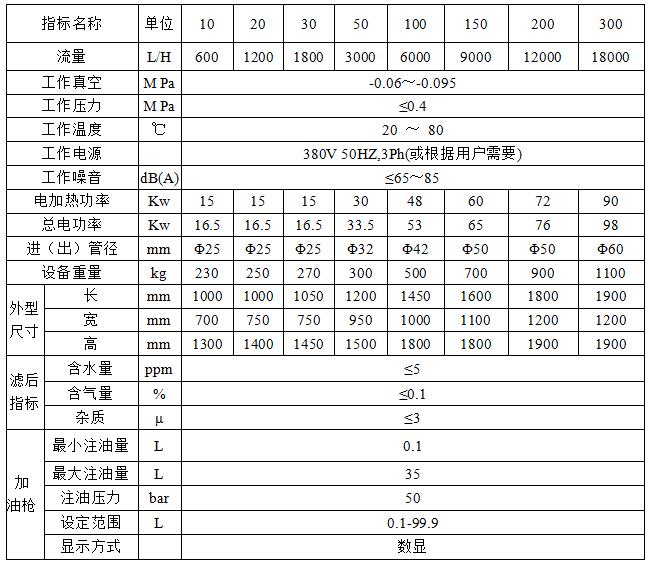 同時可用于對電氣設備抽真空、真空注油、加油、過濾等。使用時先用真空泵將電氣設備上面的金屬膨脹器上部抽到高真空后,絕緣油可以通過油管下部自動注油或通過油泵注油到設備所屬的正常油位。保證充油設備內的殘余氣體特別是線圈間的氣體首先被抽掉,設備注油、補油更方便安全,油質不污染,能保證設備原有絕緣性能。也是各電廠、電站、變電所、電器制造廠、工礦企業過濾變壓器油、透平油、機油、液壓油等油液中的少量水份、氣體和雜質的理想設備。